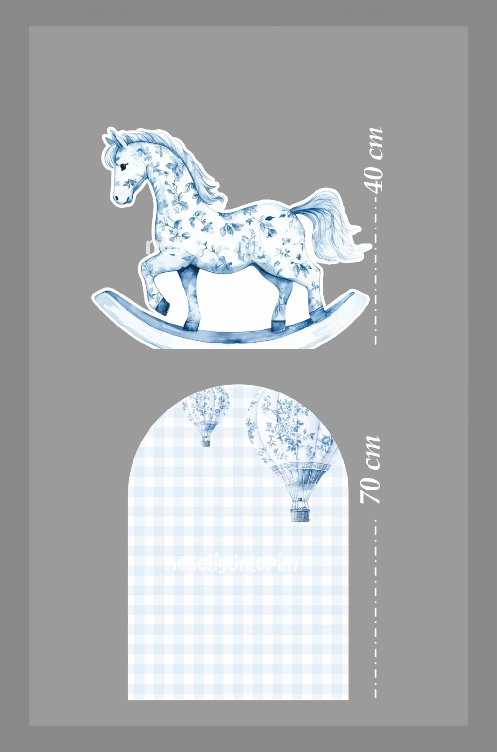 • 2'li Ayaklı Pano Seti Pötikare Uçan Balonlu Mavi Fon, Sallanan At Temalı / 70cm - 40 cm