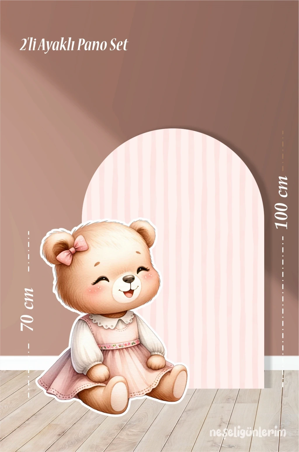 2'li Ayaklı Pano Seti Pudra Çizgili, Elbiseli Oturan Sevimli Ayıcık Temalı / 100 cm - 70 cm