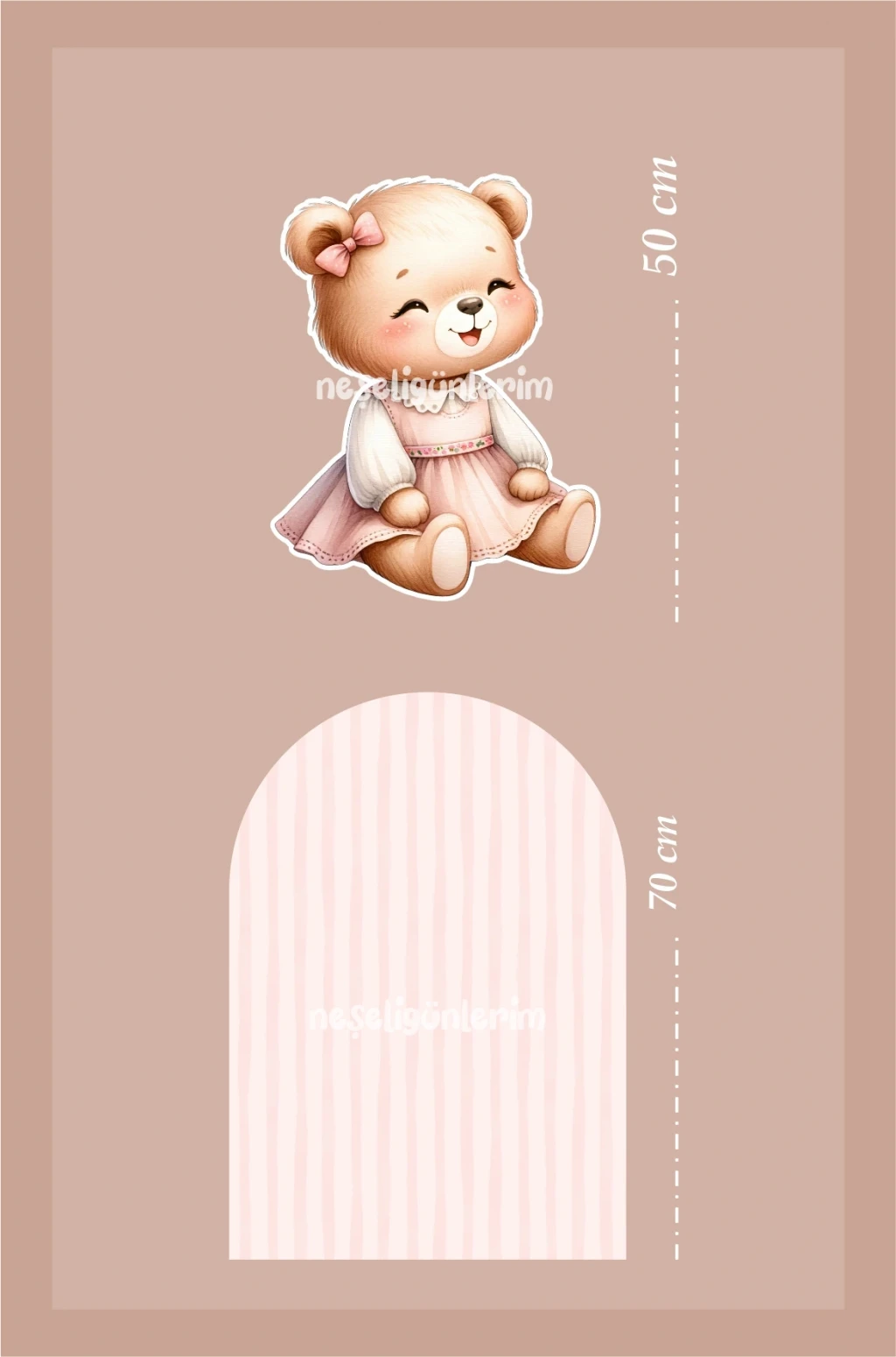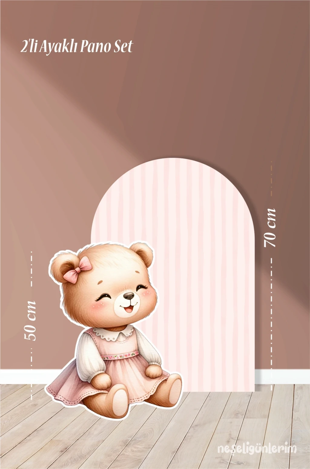 • 2'li Ayaklı Pano Seti Pudra Çizgili, Elbiseli Oturan Sevimli Ayıcık Temalı / 70cm - 50 cm