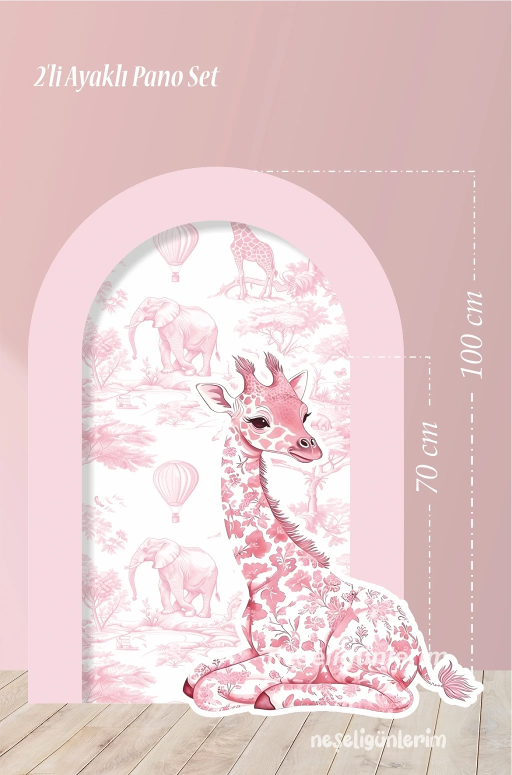 • 2'li Ayaklı Pano Seti Soft Pembe Safari Konseptli ve Oturan Zürafa Dekoru / 100 cm - 70 cm