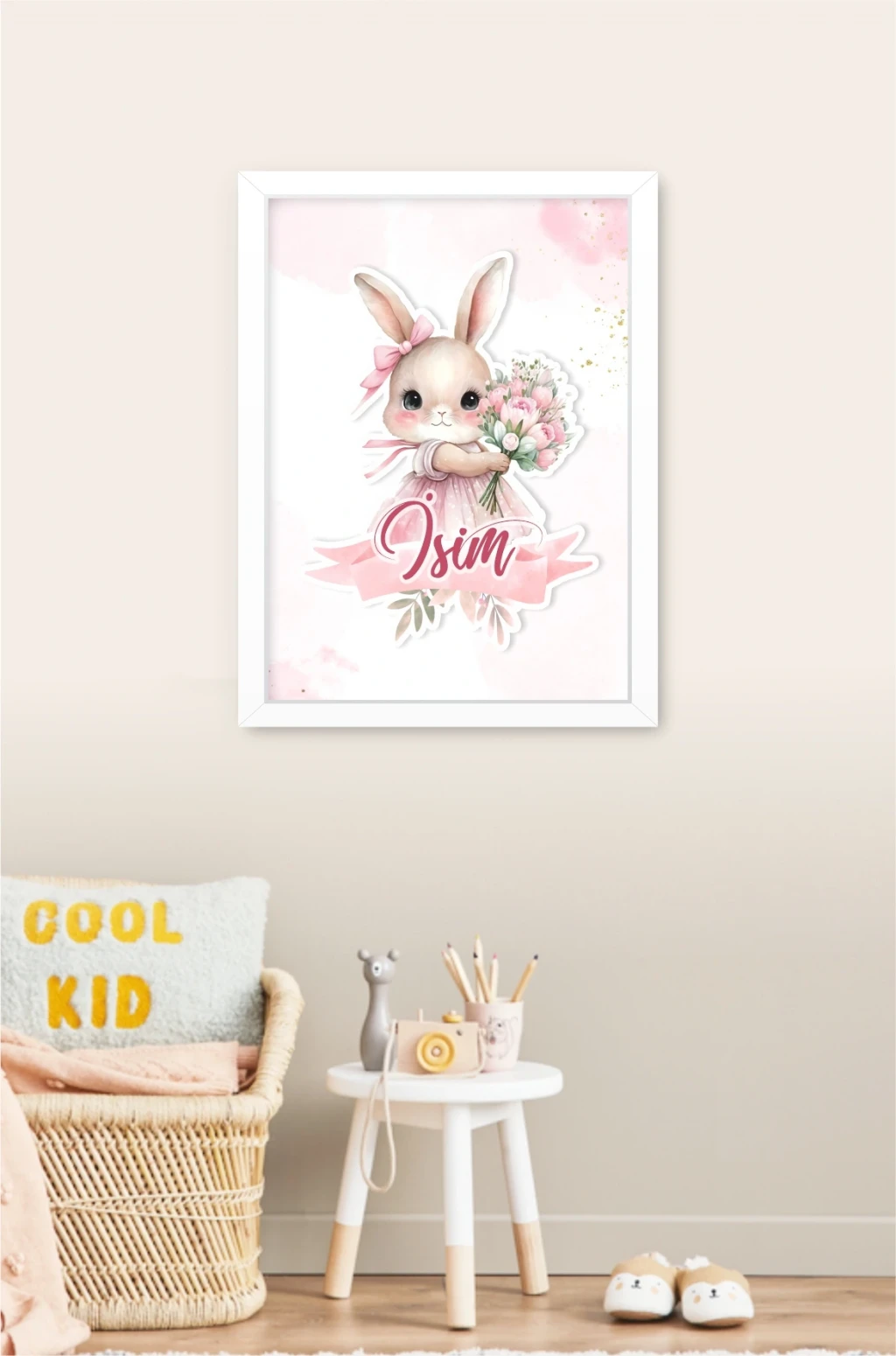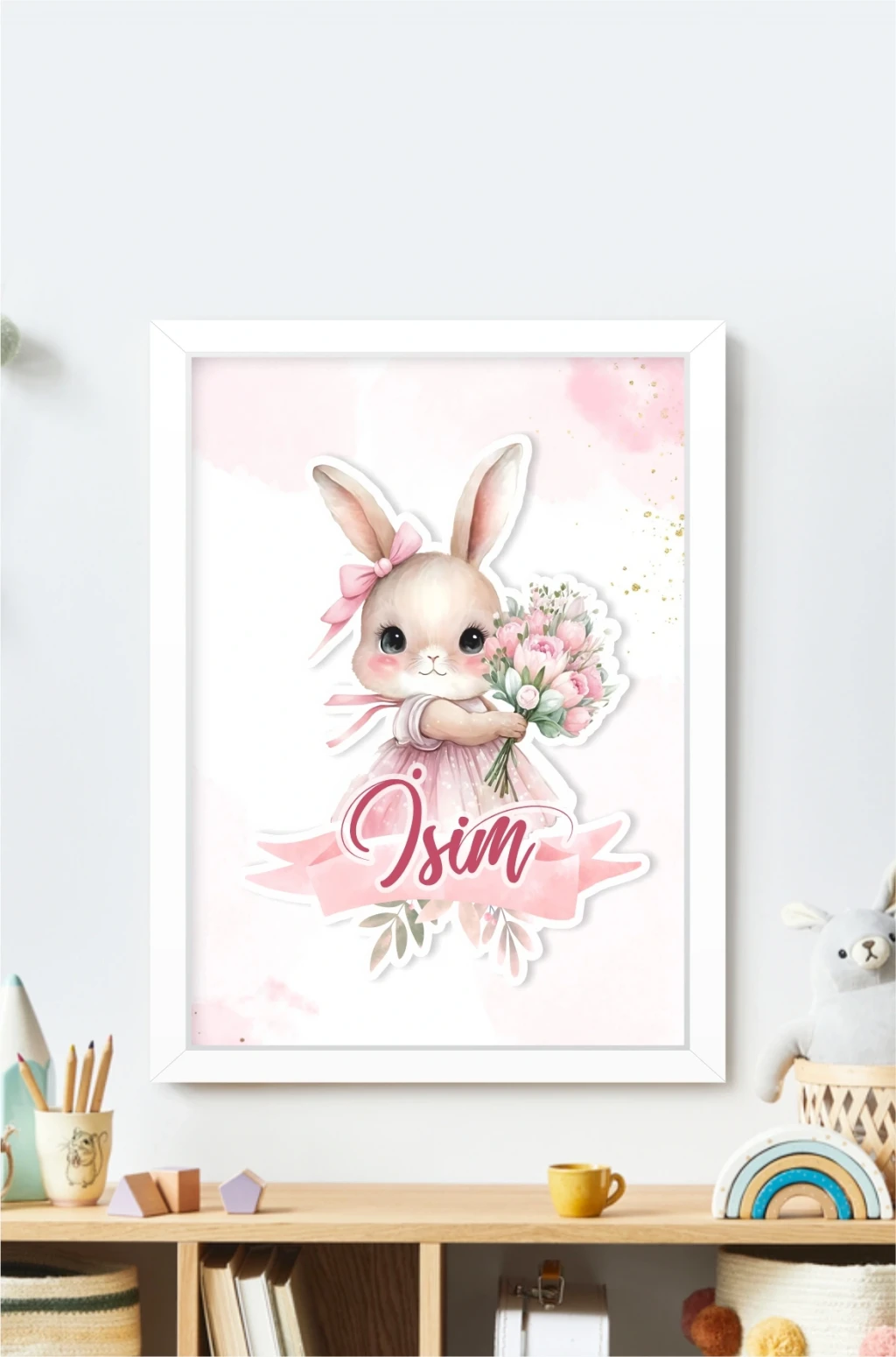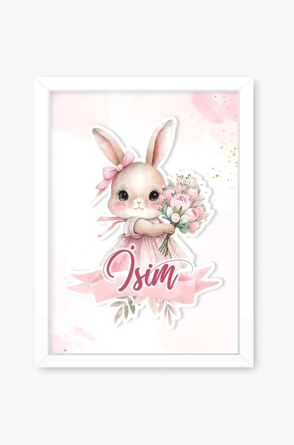 İsme Özel Pembe Çiçekli Tavşan Beyaz Çerçeve 30x40 cm Tablo, Hastane Odası Kapı Süsü, Çocuk Odası, Dekorasyon